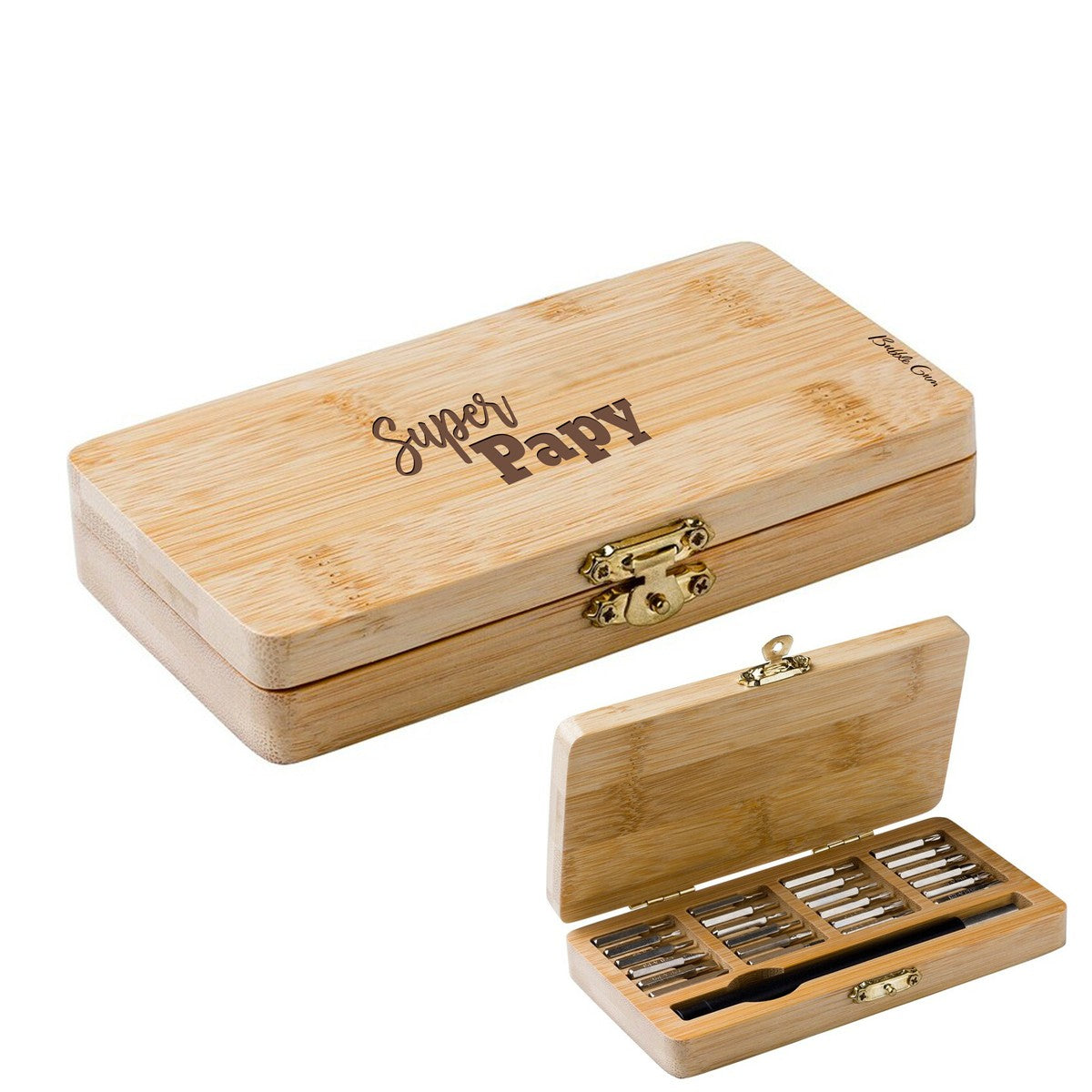 Boîte en bois bambou gravée contenant un tournevis et 24 embouts.