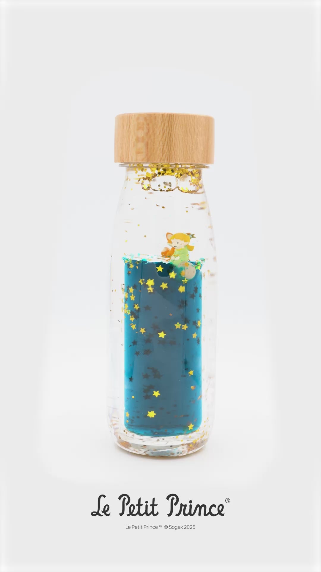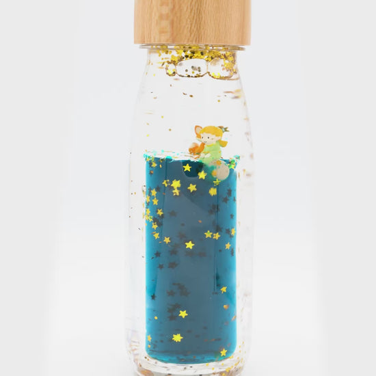 Bouteille sensorielle Petit Prince avec étoiles flottantes et renard. Agitez pour créer un univers magique apaisant.
