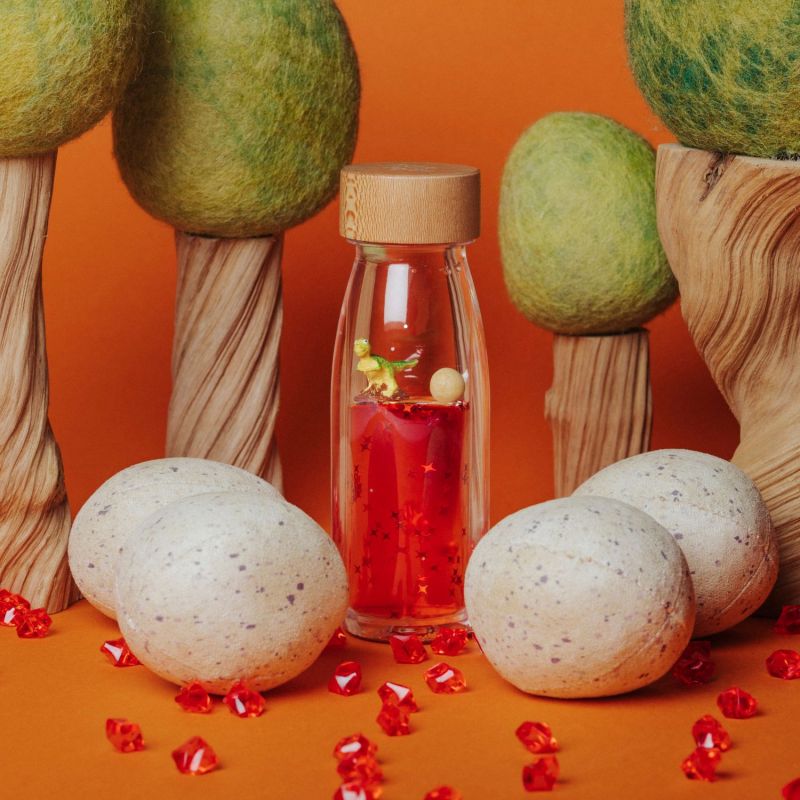 Le roi des dinosaures est sorti de son oeuf et trône majestueusement au coeur de notre bouteille sensorielle Move spéciale. Une danse calme et immersive. Le doux mouvement des gouttes de liquide coloré fascinantes éveille les sens, favorisant la relaxation et l’émerveillement.