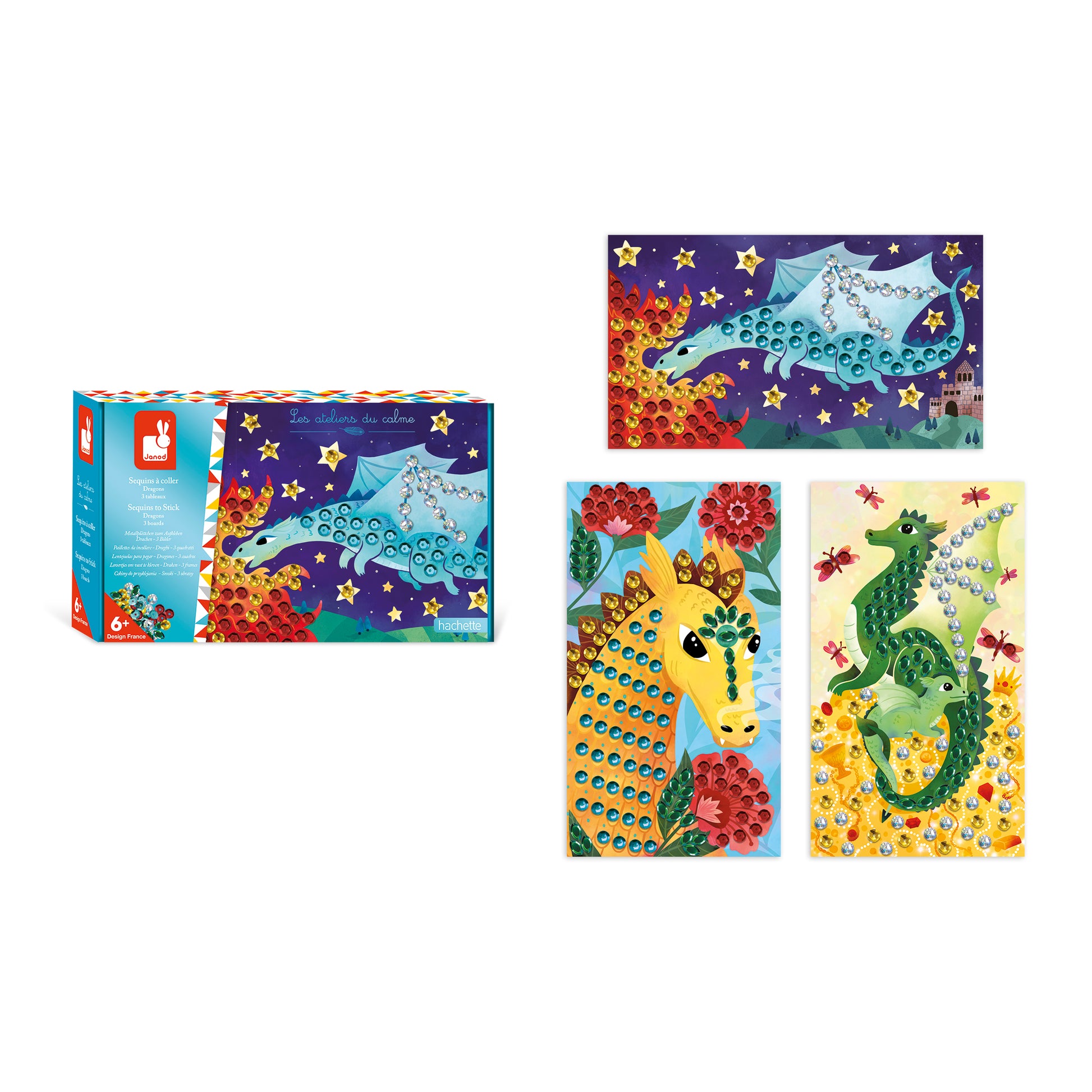 Avis aux petits artistes passionnés de dragons ! Rendez-vous avec les plus beaux spécimens que les enfants devront rendre encore plus impressionnants grâce à des sequins de toutes les couleurs ! Les 3 tableaux de ce kit créatif sont autocollants, ce qui permettra aux enfants à partir de 6 ans de fixer ces perles plates brillantes en suivant les indications du livret. 360 sequins de formes et de couleurs différentes permettront de réaliser de jolis tableaux que les petits aimeront garder en décoration ou offrir ! 20 minutes sont prévues pour terminer un tableau. Grâce à cette activité, l'enfant développe sa dextérité et sa concentration.