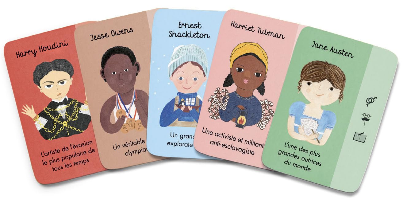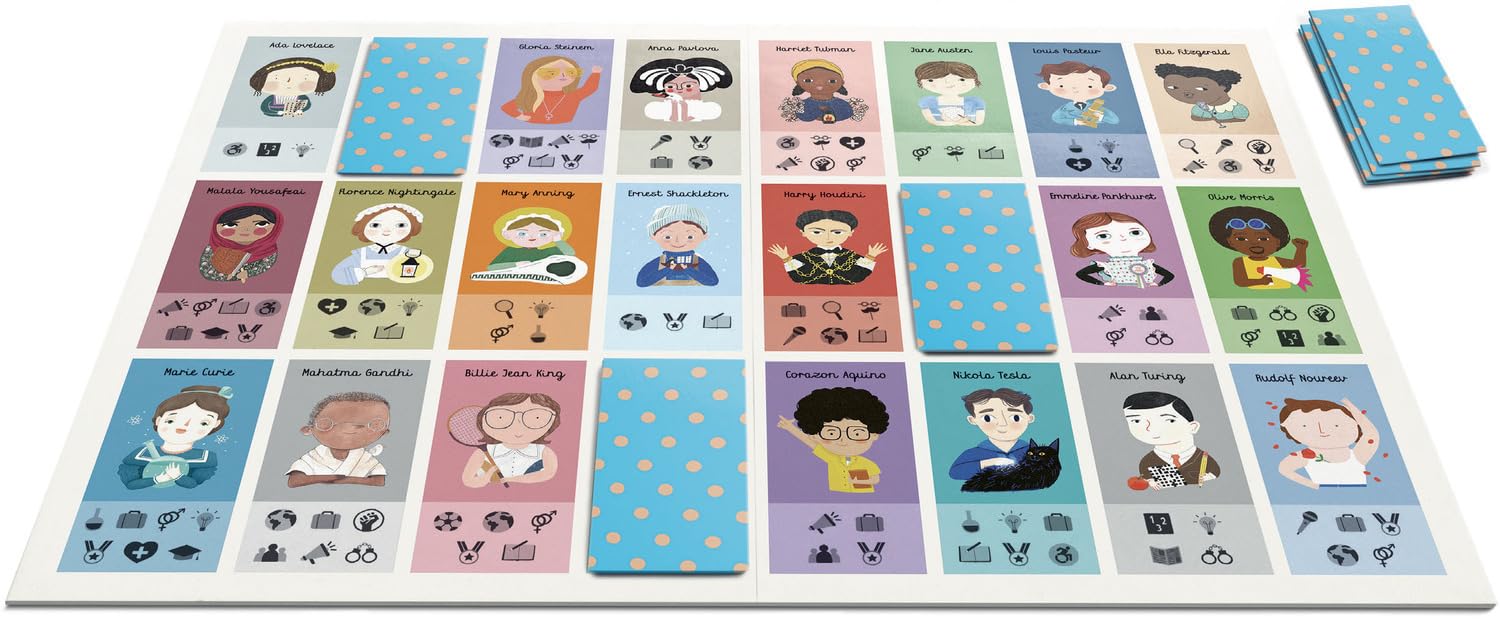 Contrairement aux jeux de déduction classiques, ce jeu ne se base pas sur l'observation des tenues, des coupes de cheveux ou des accessoires, mais sur les différents accomplissements des personnages. Tu en apprendras plus sur la vie de ces hommes et de ces femmes remarquables et inspirants, tout en t'amusant !