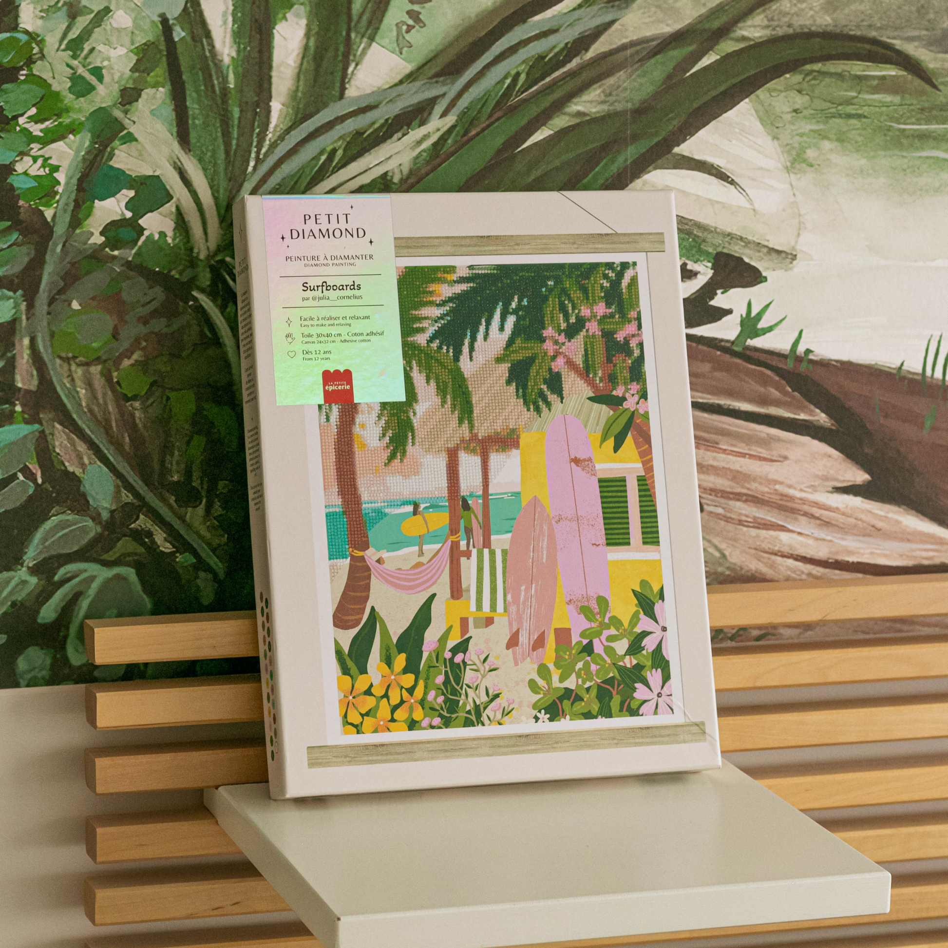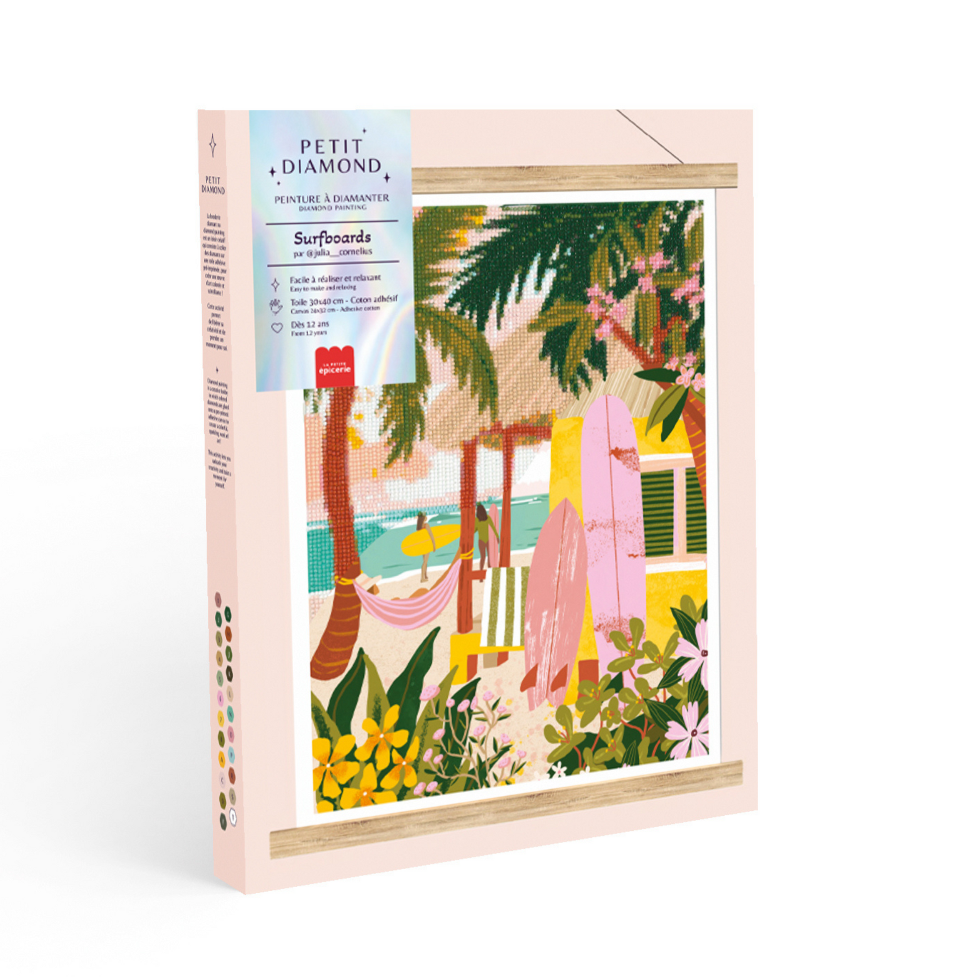 Le Petit Diamond Surfboards séduit par son design inspirant qui incarne l’esprit de l’aventure et du farniente. Ce coffret exclusif conçu par La Petite Épicerie offre un moment de détente créatif tout en rendant hommage à l’univers du surf et des plages ensoleillées. Les détails soigneusement illustrés, comme les planches colorées et le hamac, associés à l’éclat des diamants, font de ce tableau une pièce unique et vibrante. Parfait pour les amateurs de sports nautiques ou ceux qui rêvent d’évasion, ce diamond painting convient à tous les niveaux, grâce à une activité simple et gratifiante. Le plaisir est au rendez-vous à chaque étape, car il permet de se détendre tout en créant un objet original, décoratif de qualité, vous pourrez personnaliser votre espace de vie grâce à ses baguettes de bois naturel qui permettent de suspendre sa création.