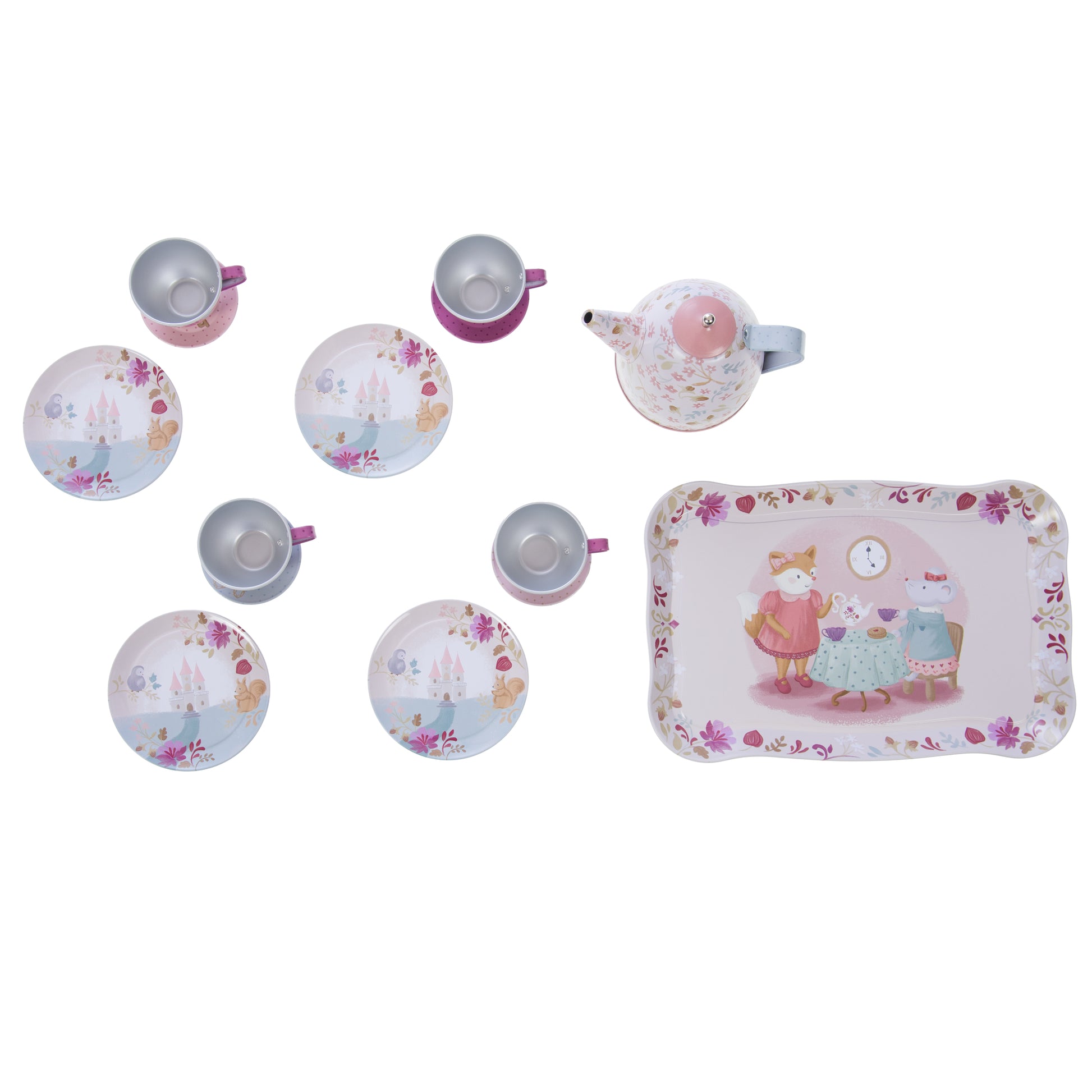 Une dinette en métal illustrée qui comprend un plateau, une théière, quatre assiettes à dessert, quatre tasses et quatre soucoupes assorties.