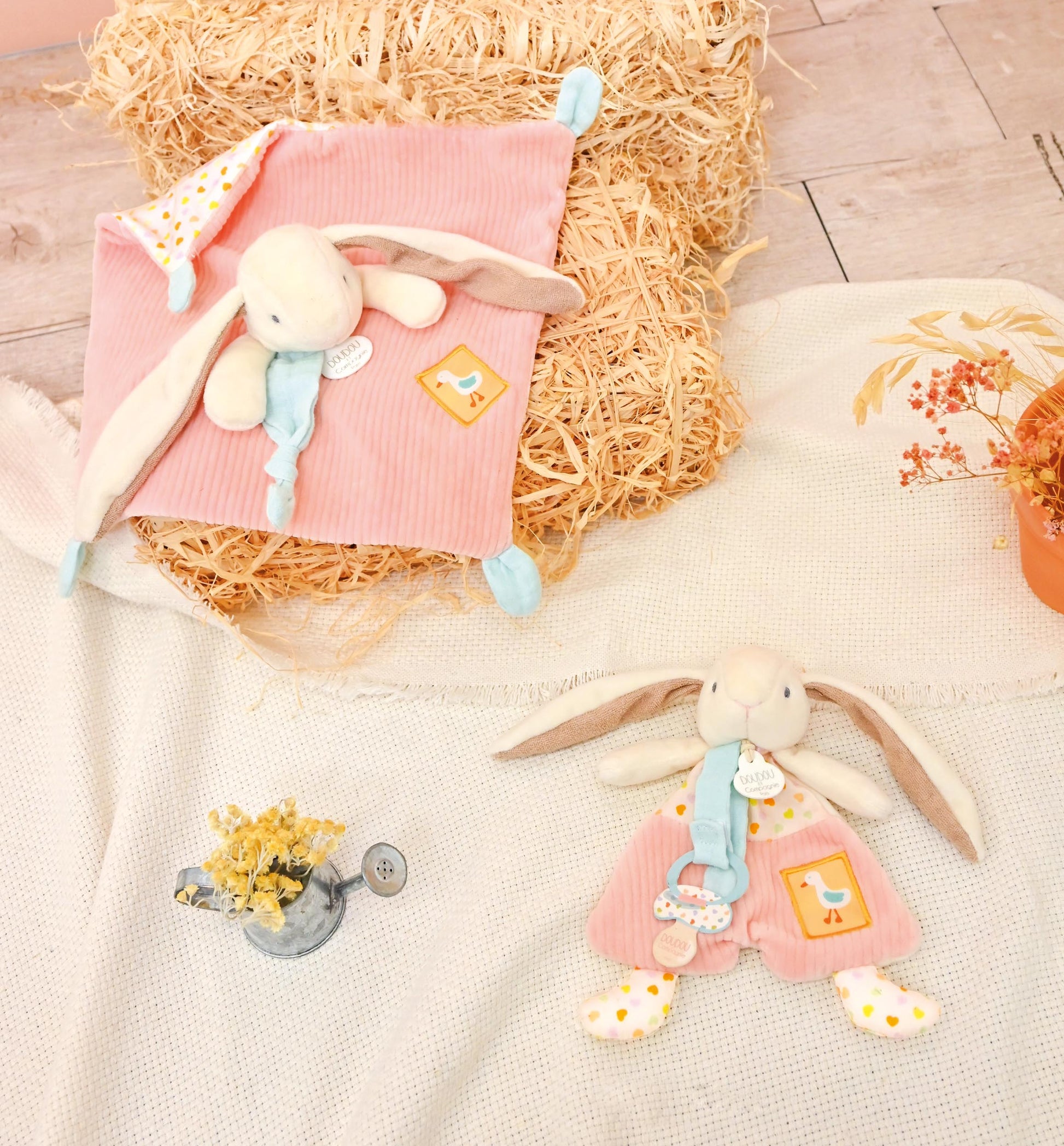 Découvrez le Doudou attache sucette Lapin Ciboulette de la collection "Dans mon jardin", un accessoire indispensable pour les bébés et leurs parents.