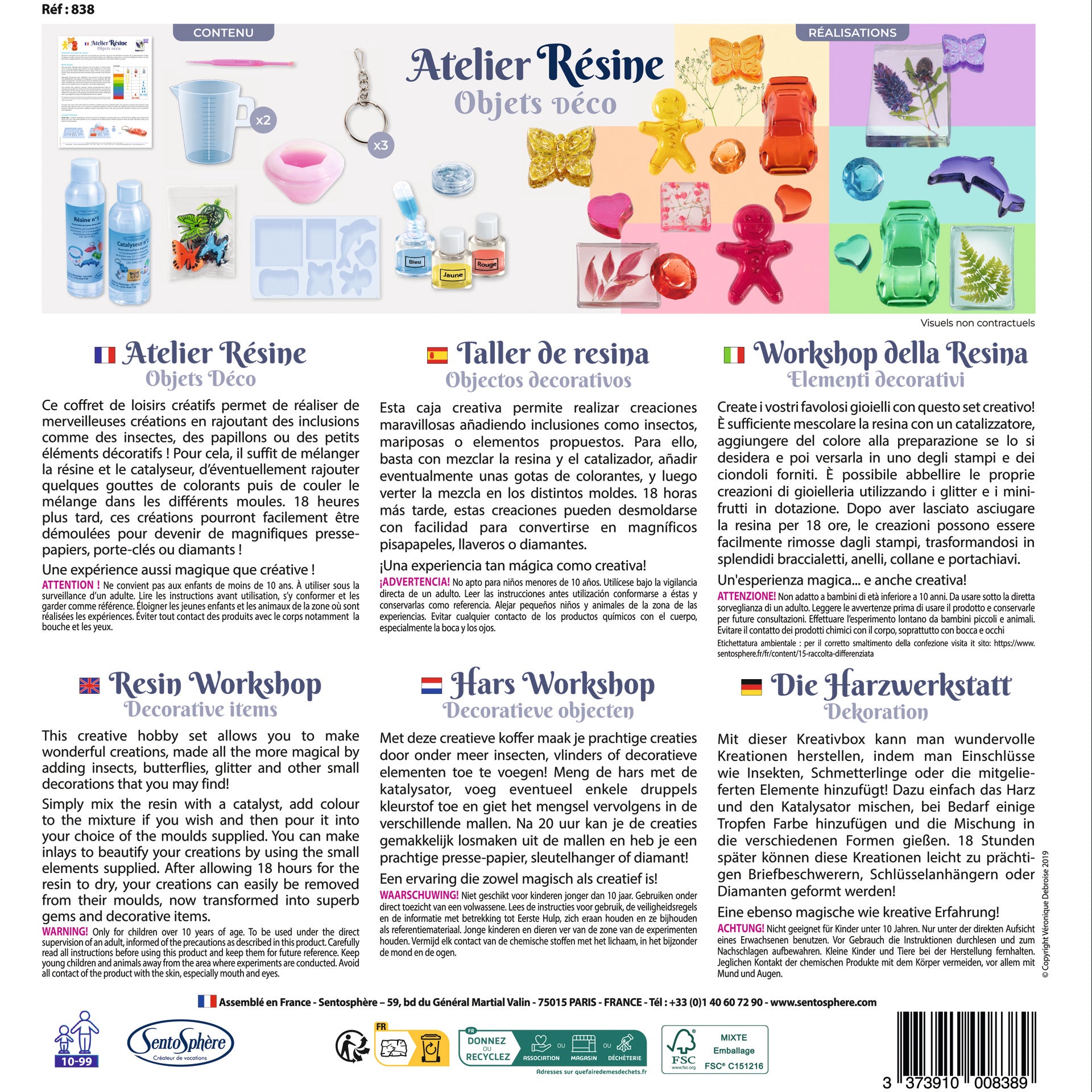 Ce coffret créatif permet de réaliser de merveilleuses créations en rajoutant des inclusions comme des insectes, des papillons ou des paillettes iridescentes ! Pour cela, il suffit de mélanger la résine et le catalyseur, d’éventuellement rajouter quelques gouttes de colorants puis de couler le mélange dans les différents moules. 20 heures plus tard, ces créations pourront facilement être démoulées pour devenir de magnifique presse-papiers, porte clef ou diamant ! Une expérience aussi magique que créative qui a pour seule limite l'imagination !