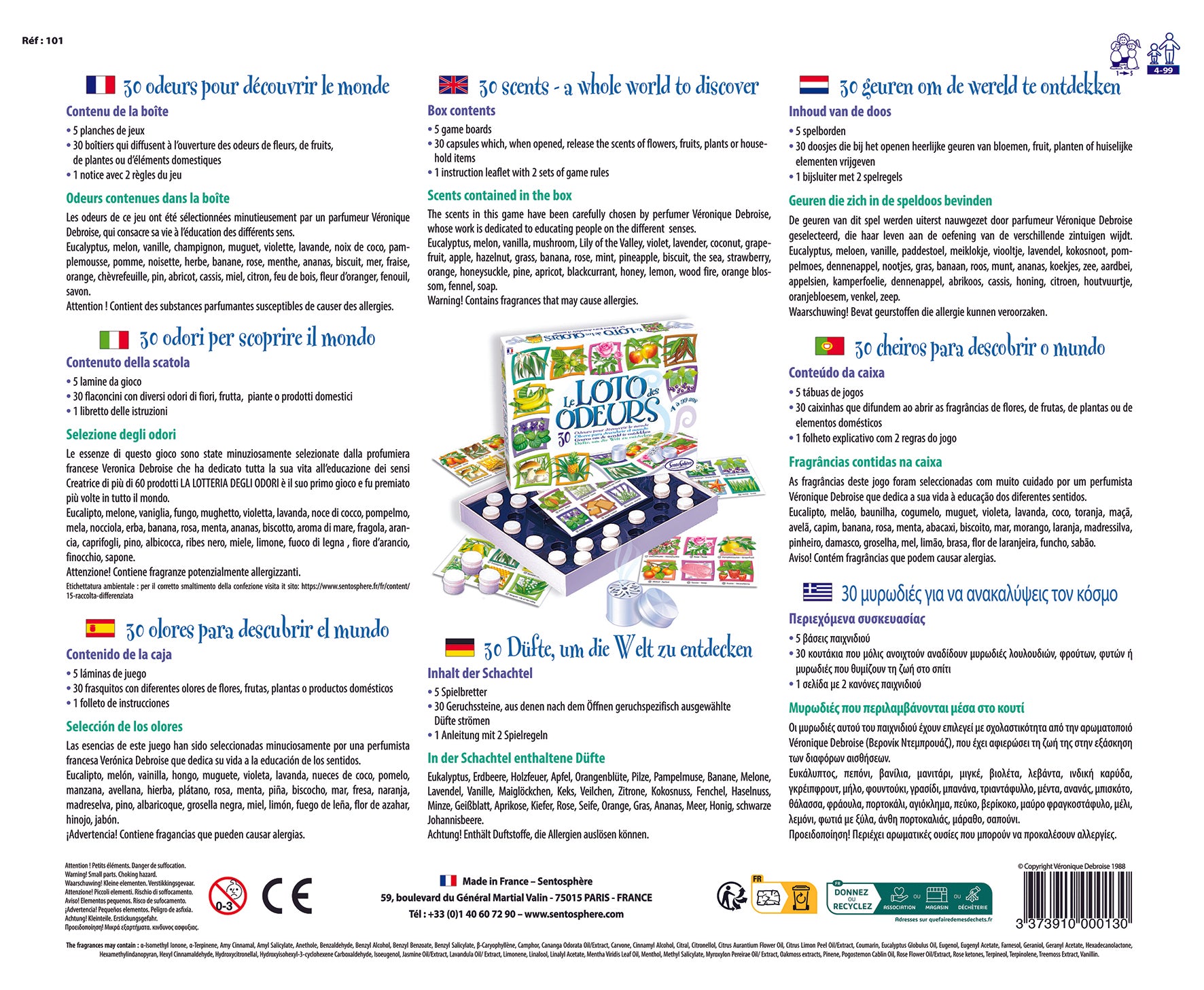 Des fruits exotiques ou de nos sous-bois aux fleurs des jardins en passant par le parfum d’éléments de la vie quotidienne, redécouvrez le monde dans toute sa dimension olfactive grâce aux 30 godets du Loto des odeurs. Ce jeu riche en découvertes permet un échange très riche entre parents et enfants.