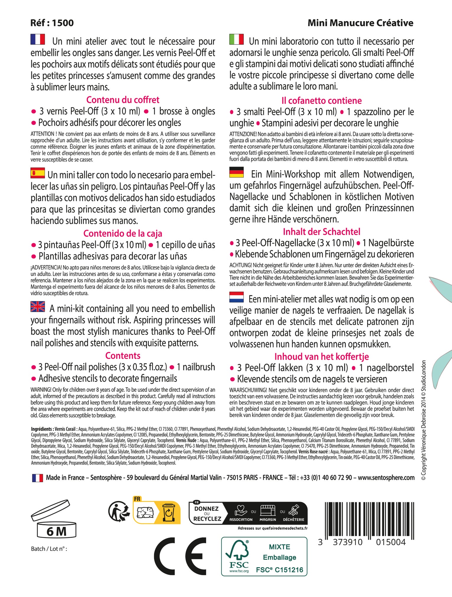 Ce coffret a été testé selon les normes cumulées du Jouet et de la Cosmétique. Il contient des ingrédients et des formules qui ne présentent aucun danger pour la peau des enfants.