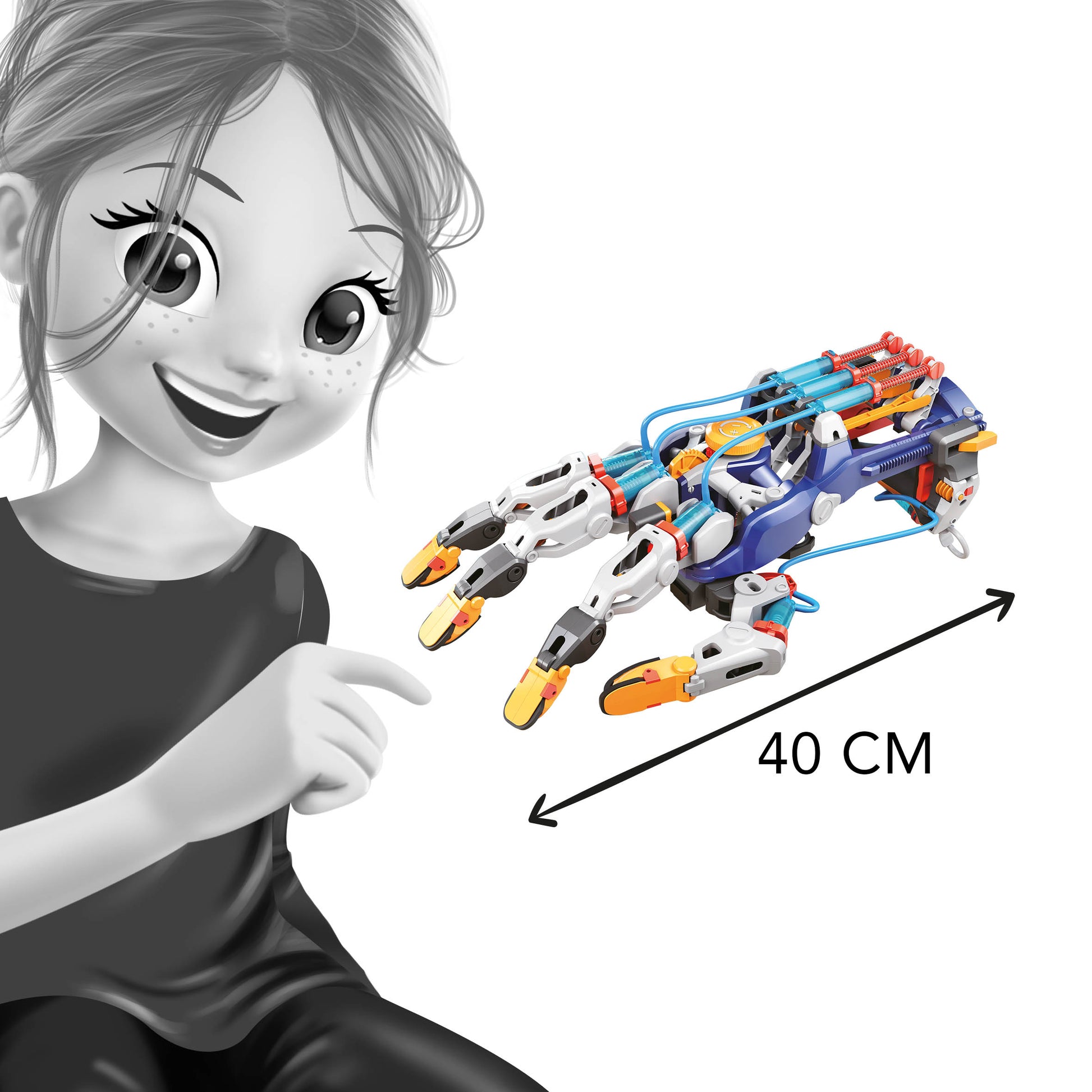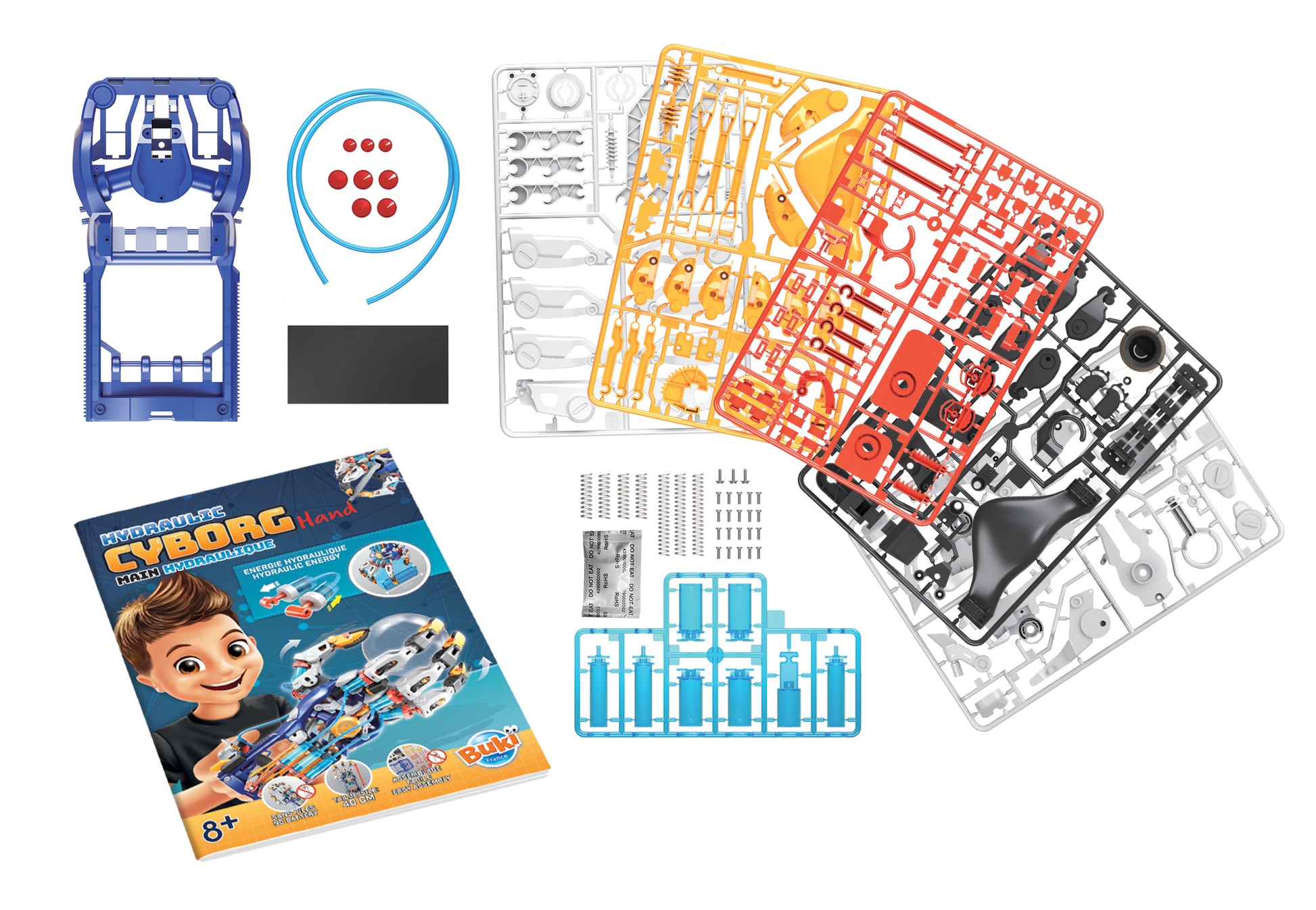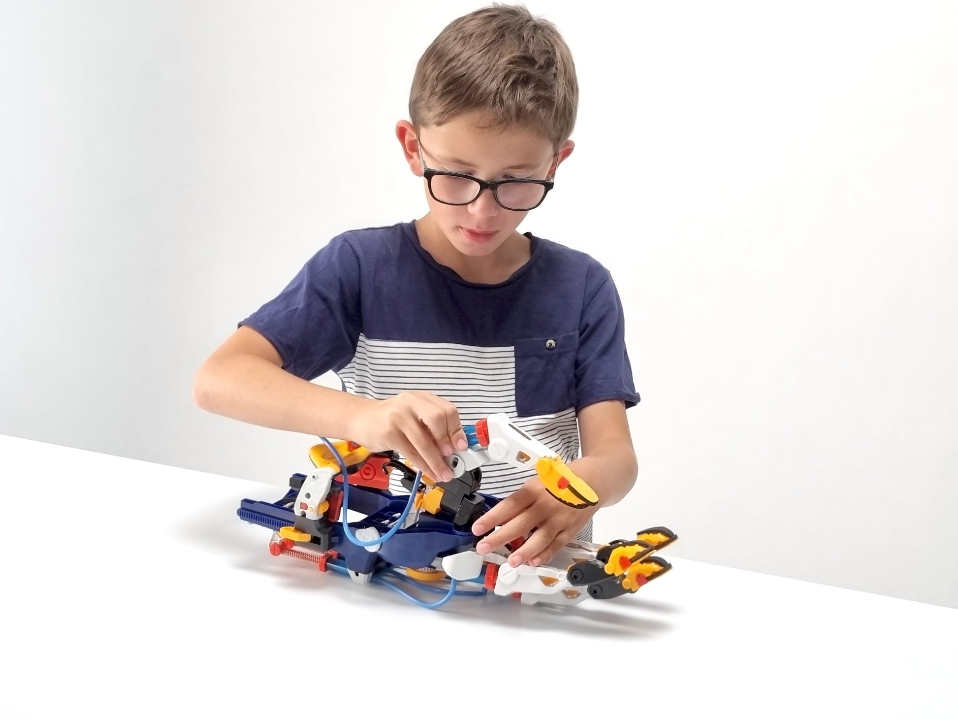 Construis une main cyborg articulée en assemblant les pièces. Ajoute de l'eau dans le système et pilote-la du bout des doigts.