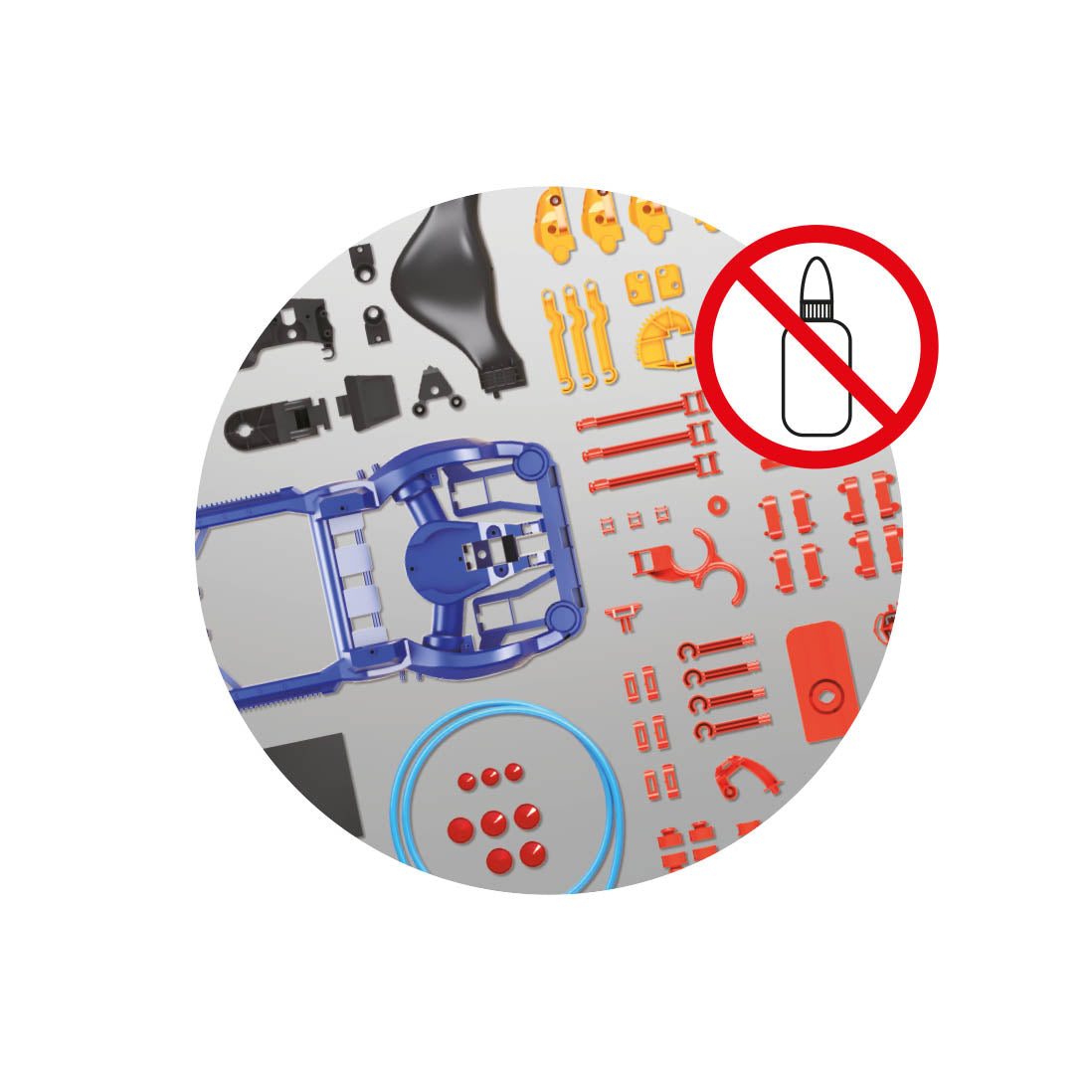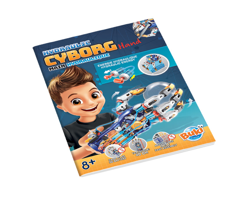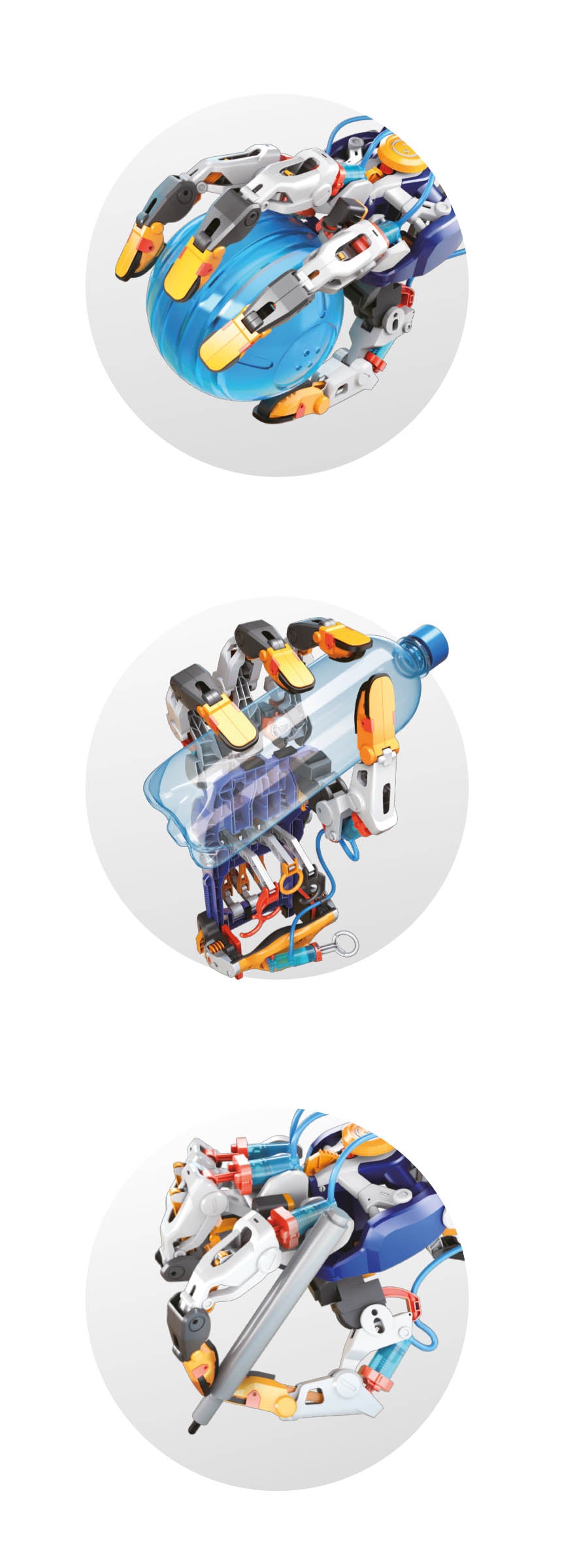 Construis une main cyborg articulée en assemblant les pièces. Ajoute de l'eau dans le système et pilote-la du bout des doigts.