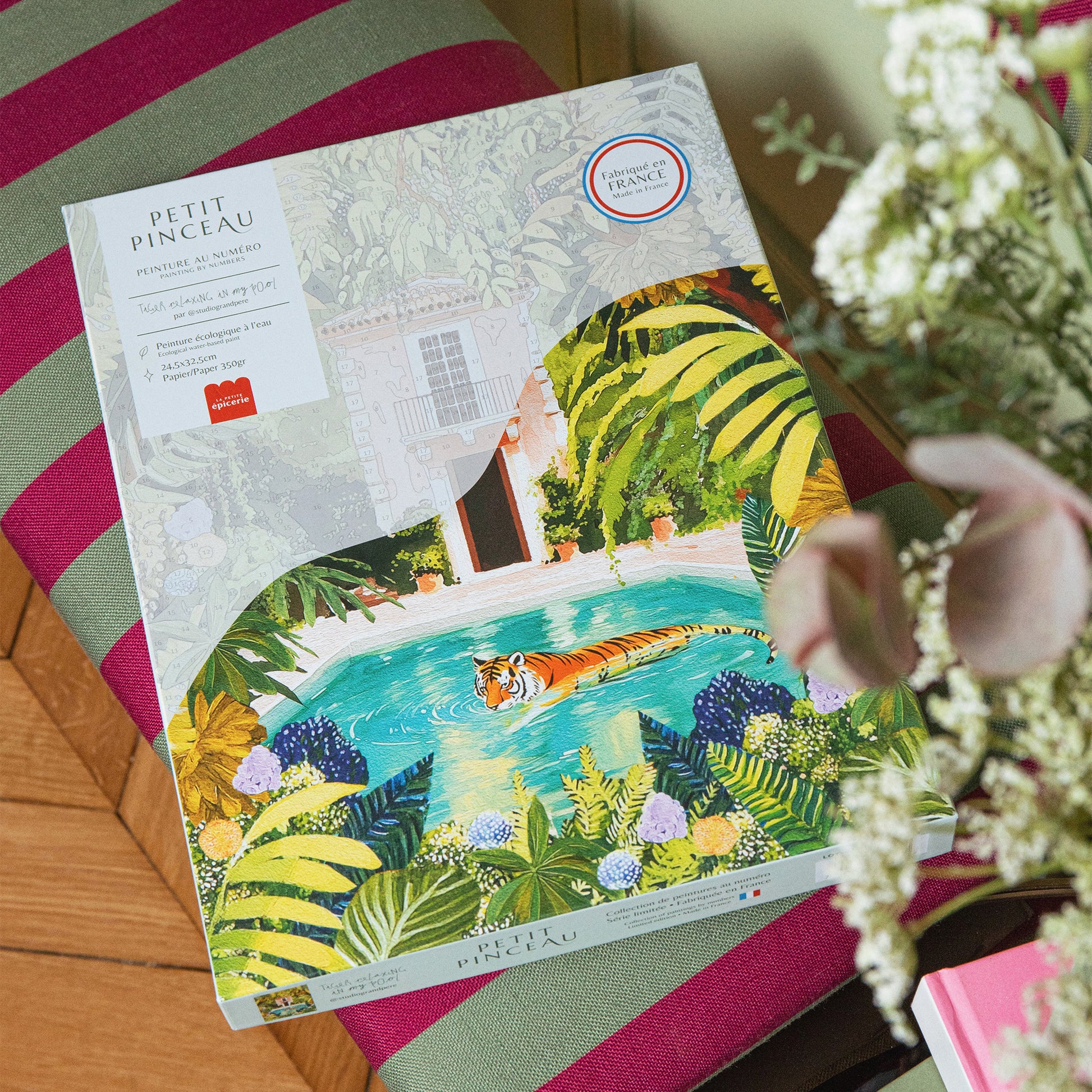 Partez pour un voyage tropical avec Tiger Relaxing In My Pool, la peinture au numéro imaginée par Studio Grand-Père (Rafaela Mascaro). Ce coffret complet et éco-responsable, fabriqué en France, vous invite à peindre un tigre flamboyant au bord d’une piscine dans une jungle luxuriante.
